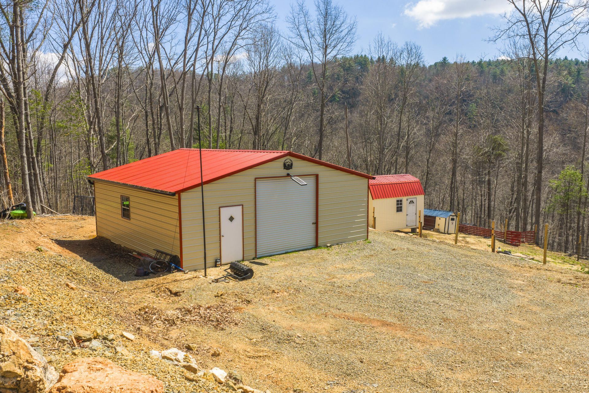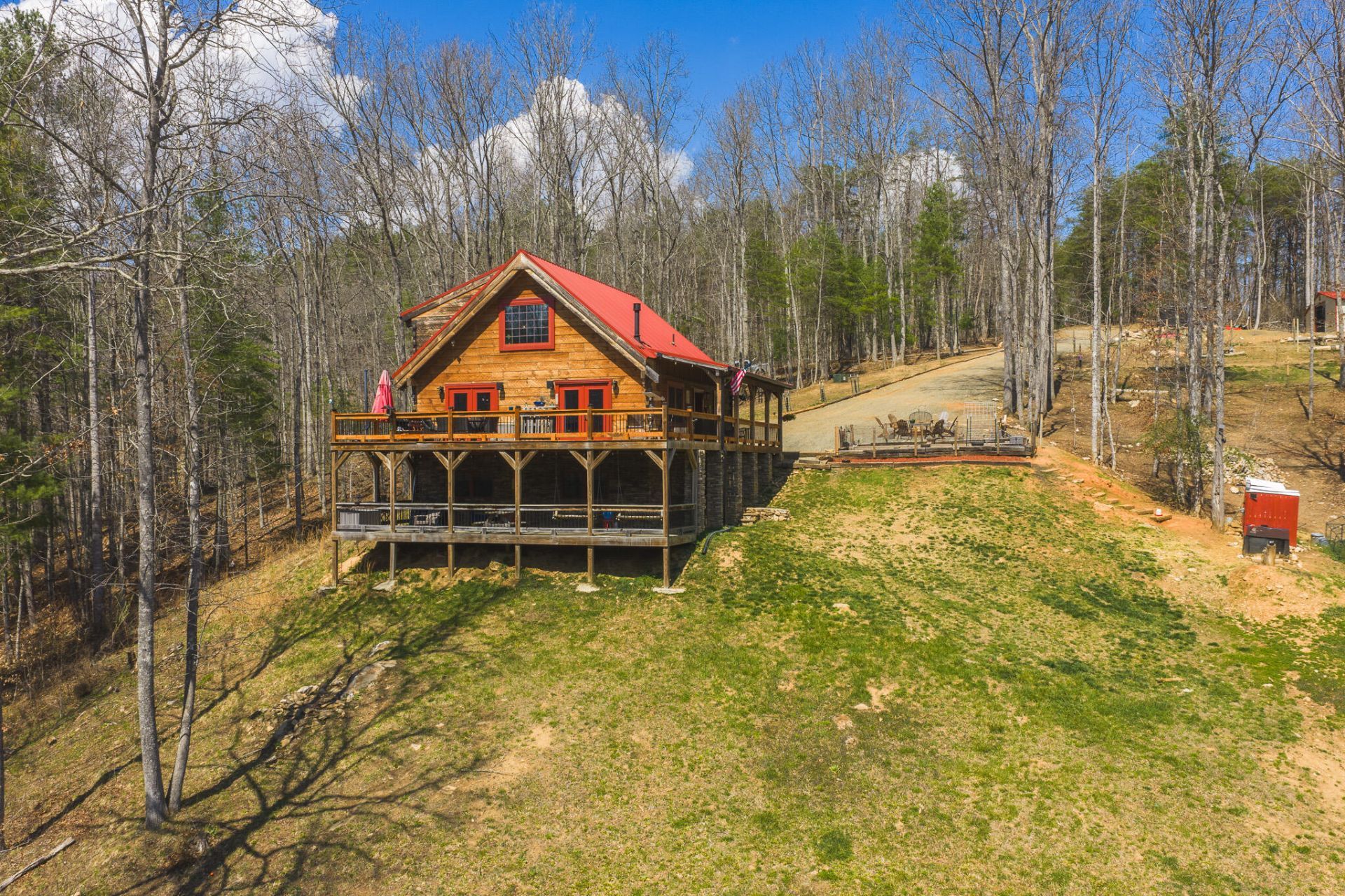 Custom hand-hewn log cabin constructed in 2018 on 6.82 private acres with 300+ feet of frontage on Big Reed Island Creek. This 3 bedroom, 3 bath home offers quality craftsmanship and a beautiful setting just a short drive from Hillsville VA. Main level features an open floor plan with vaulted ceilings, spacious primary suite, and a custom rock wall shower. Loft area includes 2 bedrooms, full bath, and office space. Full basement provides additional bath, laundry, and utility area. A 2 story deck creates excellent outdoor living space for entertaining and enjoying the creekside setting. Property also includes fenced garden area, detached barn/garage with concrete slab floor, fenced livestock area, chicken coop, and cleared road to the water frontage. Large portion of furnishings will convey